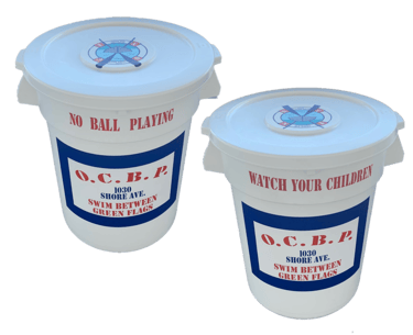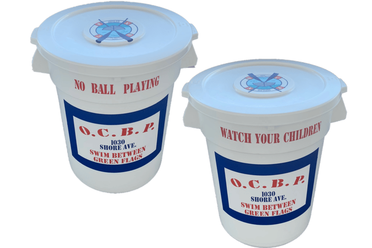 Heavy duty, plastic 32 gallon trash can resembling Ocean City lifeguard stand, with lid, and labeled with home address.